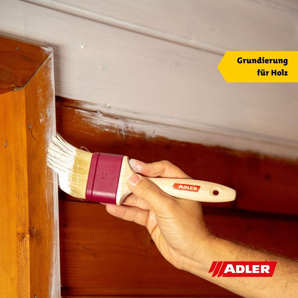 Adler Alkyd-Grund ist eine lösemittelbasierte, weiße Grund- und Zwischbeschichtung mit Korrosionsschutzwirkung für den Innen- und Außenbereich. Der Alkydgrund zeichnet sich durch seine sehr gute Schleifbarkeit, hohe Elastizität und Füllkraft, hervorragende Verarbeitung und Verlauf aus. Er eignet sich hervorragend zur Isolierung von färbenden Holzinhaltsstoffen und trockenen Wasserflecken.