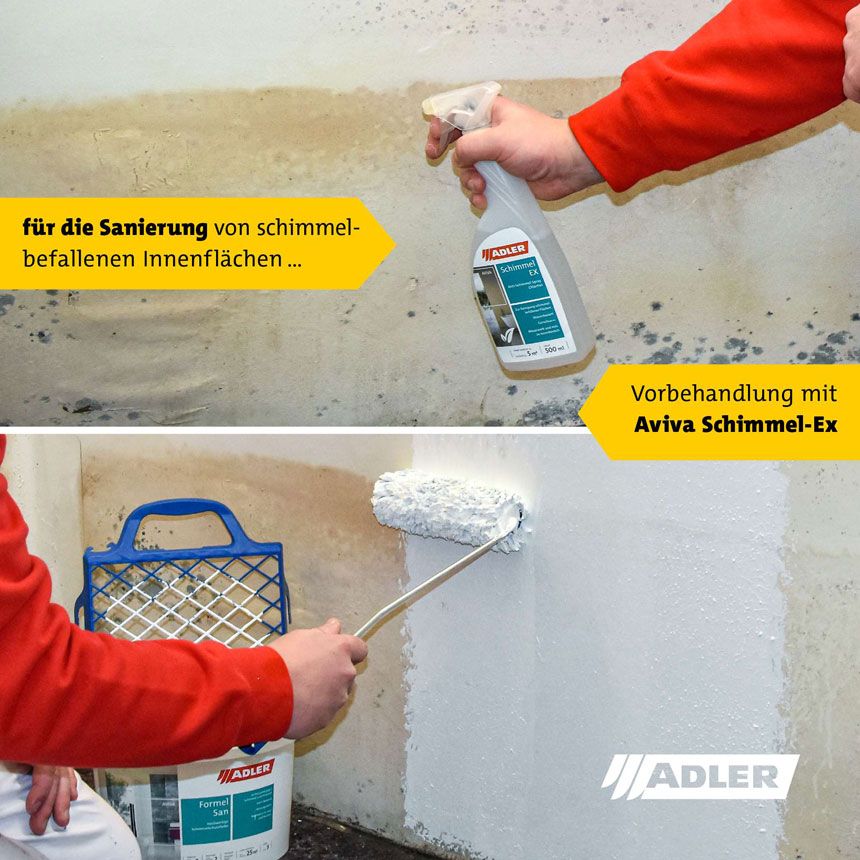 Adler Aviva Formel-San Schimmelschutz Wandfarbe ist eine stumpfmatte Anti Schimmel Farbe mit sehr hoher Deckkraft (Klasse 2) für den Anstrich von Wänden und Decken speziell im schimmelgefährdeten oder befallenen Innenbereich. Die Feuchtraumfarbe hat eine eingebauten Filmschutz gegen Schimmel- und Pilzbefall, welche sie ideal für den Einsatz in Bädern und Küchen sowie in gewerblichen Feuchtraumbetrieben. Die Wandfarbe ist Lösemittel- und Weichmacherfrei, was sehr angenehm bei der Verarbeitung und Trocknung ist. Durch die hohe Deckkraft genügt meistens nur ein Anstrich.