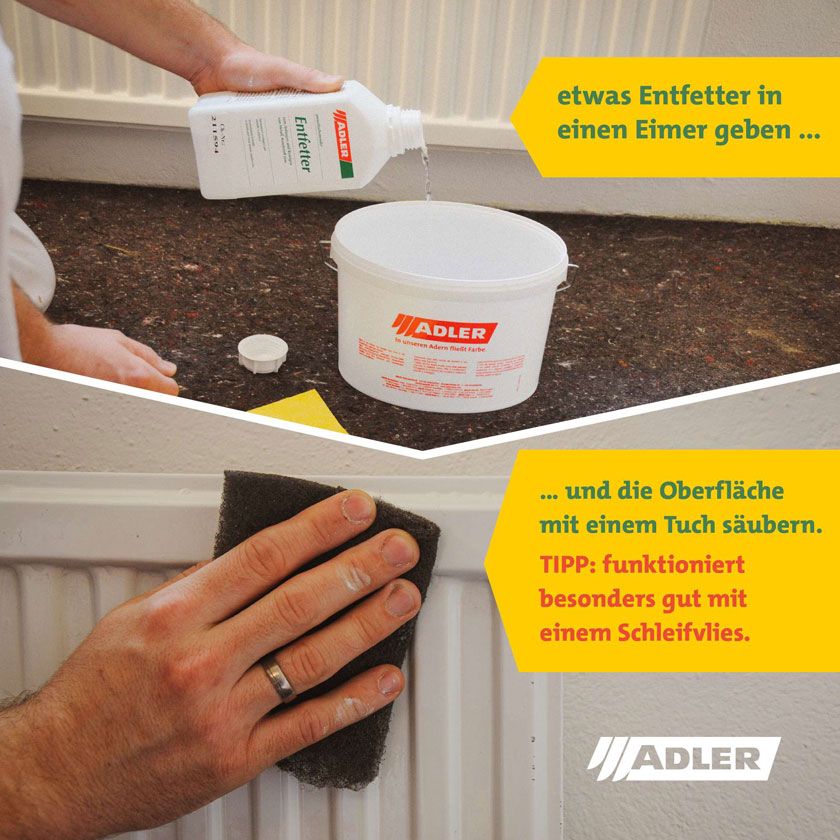 Der Auftrag erfolgt mit Pinsel oder Schwamm. Die zu behandelnden Flächen gut benetzen und mit Scheuervlies reinigen. Nach 5-10 min Einwirkzeit des ADLER Entfetters mit Wasser nachwaschen. Nach Trocknung kann die Oberfläche mit dem gewünschten Lacksystem beschichtet werden.