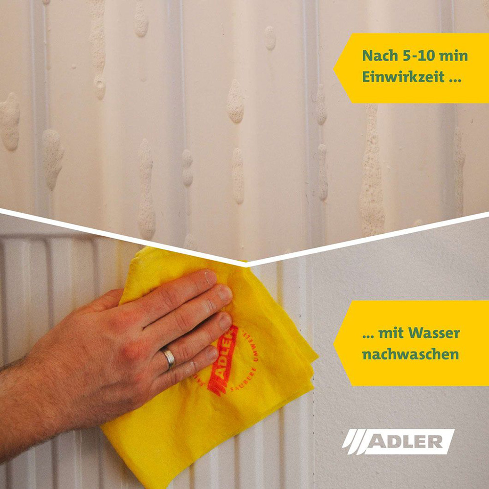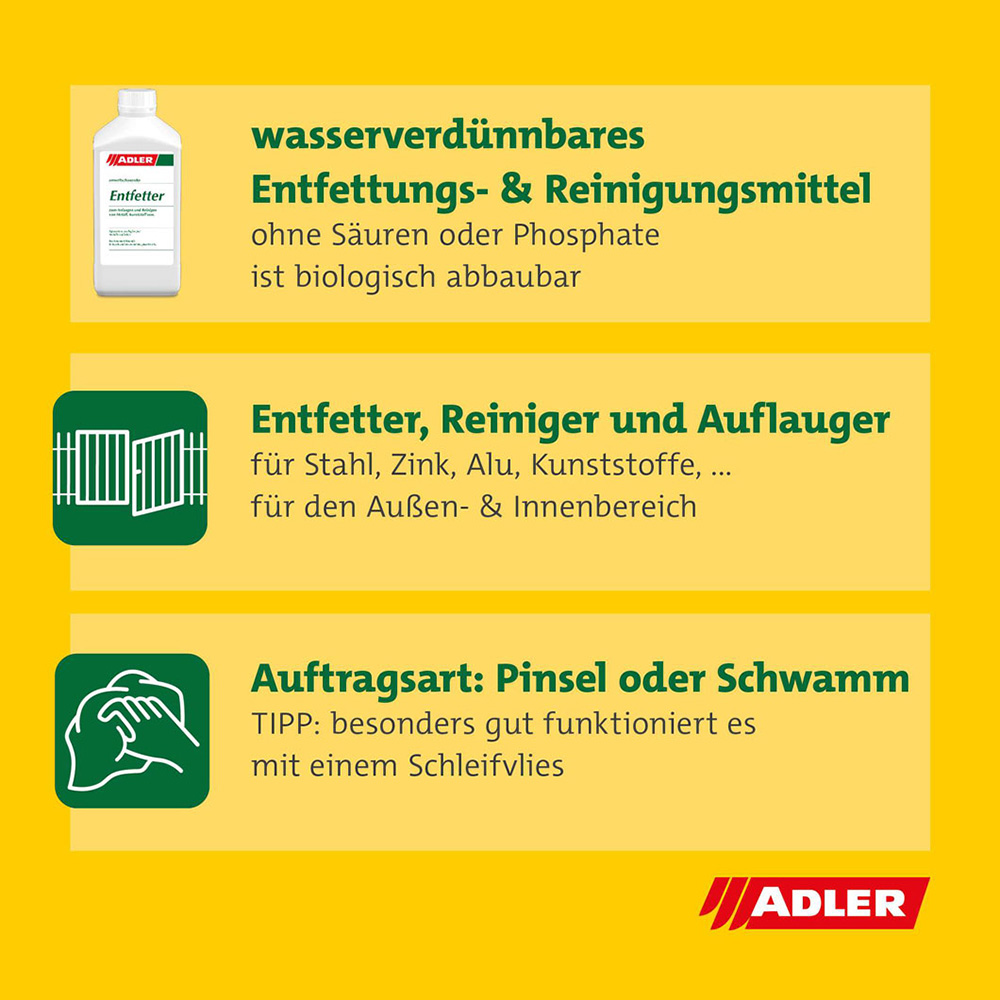 Adler Entfetter ist ein lösemittelfreies, wasserverdünnbares Entfettungs- und Reinigungsmittel für fettartige Verschmutzungen, dass weder Säuren noch Phosphate enthält und außerdem biologisch abbaubar ist. Der Entfetter kann auch als Reiniger und Anlauger genutzt werden.