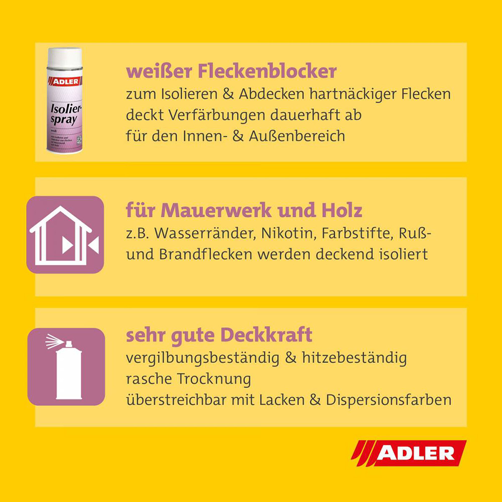 Adler Isolierspray ist ein lösemittelbasiertes, weißes Isolierspray zum Isolieren und Abdecken von Flecken im Innen- und Außenbereich. Das Isolierspray ist mit allen gängigen Lacken und Dispersionsfarben überstreichbar und ist mit sehr guter Deckkraft, einem sehr guten Verlauf und vergilbungsbeständigkeit ausgerüstet. Außerdem ist das Isolierspray Temperaturbeständig bis 80°C.