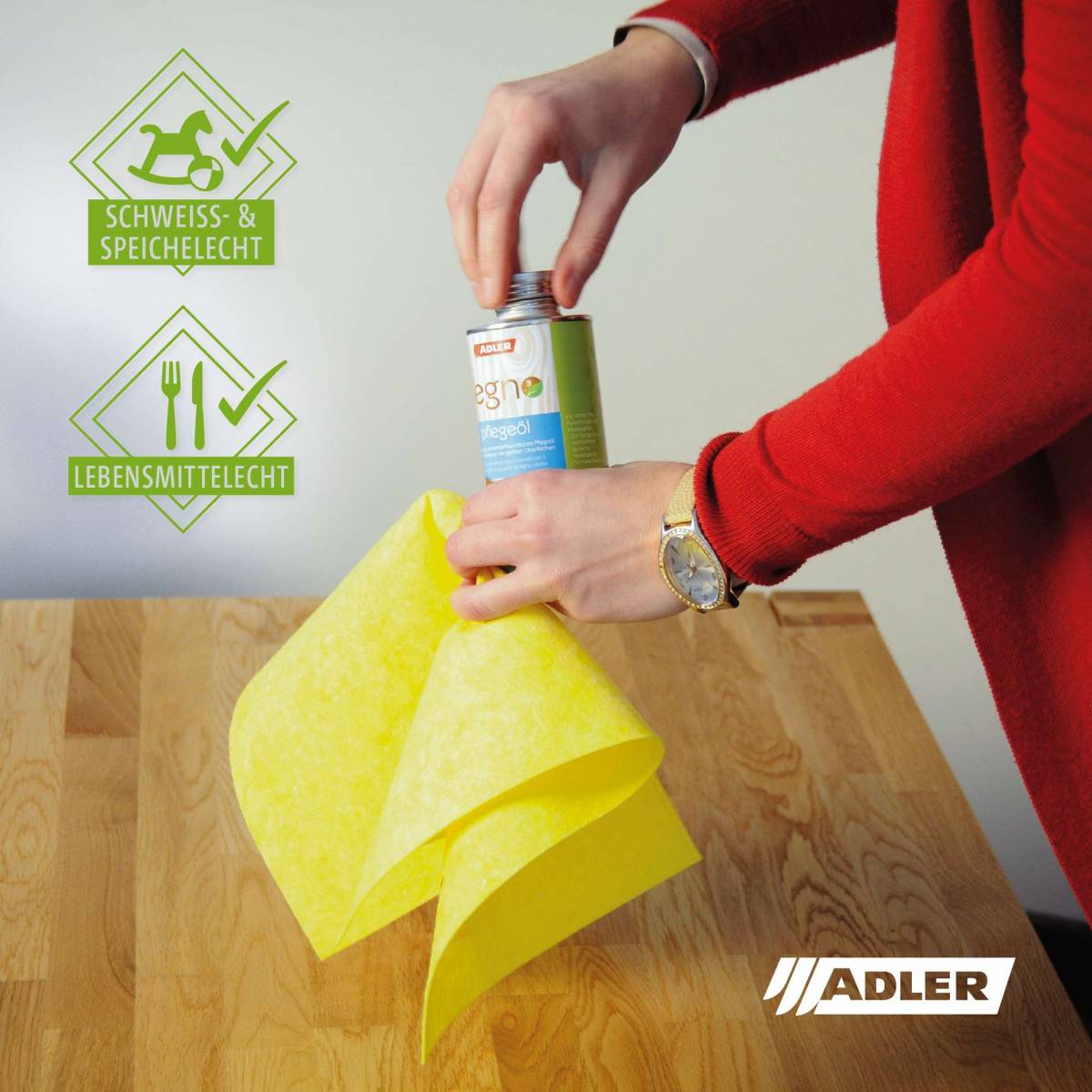 Das Adler Pflegeöl wird mit einem weichen Tuch aufgetragen. Das Aufgetragene Pflegeöl kurz einwirken lassen und dann den Überschuss sorgfältig mit einem Baumwolltuch oder Gazeballen in Faserrichtung abziehen. Bei stark abgenutzten Oberflächen kann ein zweimaliger Auftrag notwendig sein.