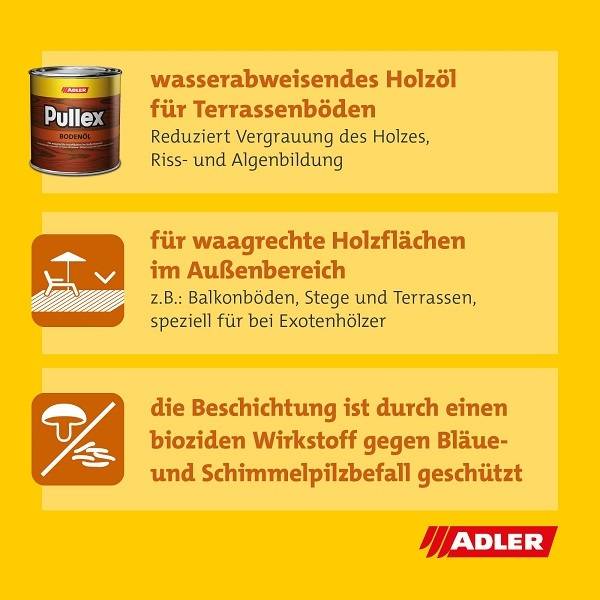Adler Pullex Bodenöl ist ein wasserabweisendes, lösemittelbasiertes Holzöl für Terrassen im Außenbereich. Das Holzöl schützt das Holz vor Verschmutzungen, Feuchtigkeit, Bläue- & Schimmelpilz und lässt das Holz atmen. Durch Spezialpigmente zeichnet sich das Holzöl durch seine sehr gute Wetter und UV-Beständigkeit sowie ausgezeichnete Farbtonstabilisierung von Exotenhölzern aus.