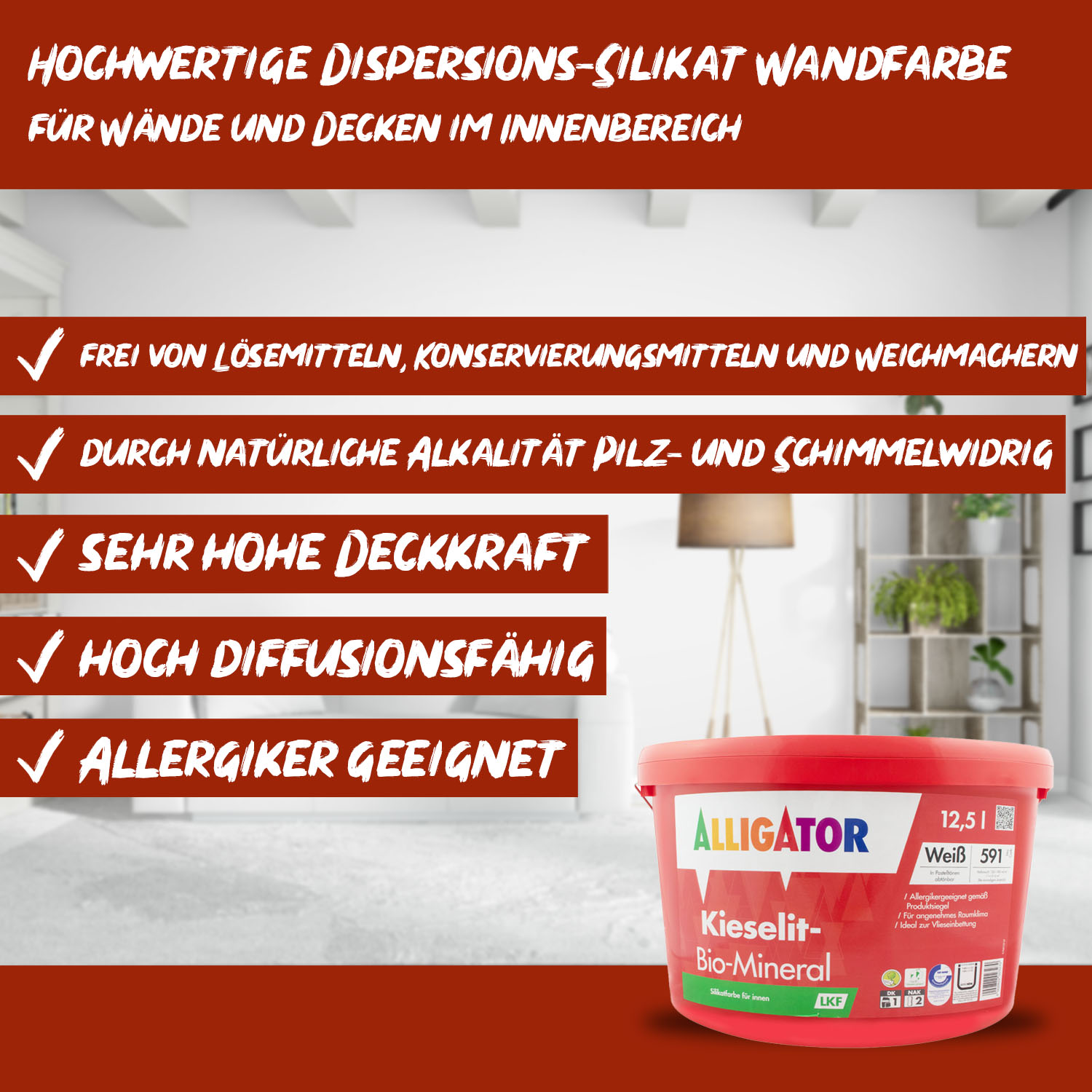 Alligator Kieselit Bio Mineral LKF ist bestens geeignet für den Anstrich von hochwertigen Decken und Wänden im Innenbereich. Der strahlende stumpfmatte Weißton sorgt für eine beruhigende Atmosphäre zum Wohlfühlen. Aufgrund der extrem hohen Deckkraft (Deckkraftklasse1) werden farbige Wände mit einem Anstrich wieder strahlend weiß. Die Wandfarbe ist frei von Lösemitteln, Weichmachern und ist schadstoffgeprüft, was sie sehr umweltfreundlich macht. Zusätzlich hat diese Wandfarbe keine Konservierungsstoffe und ist für Allergiker geeignet.