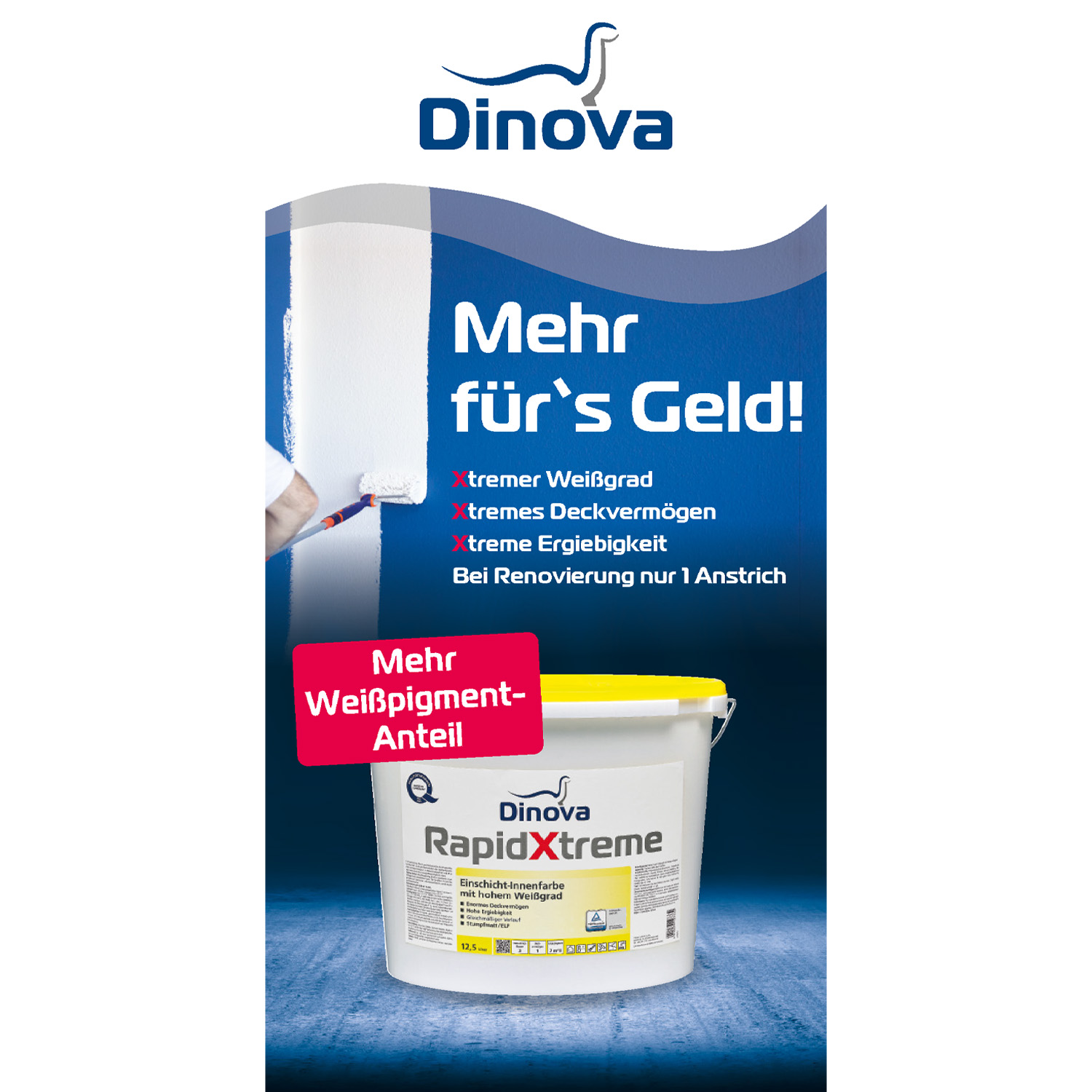 Dinova Rapid Xtreme ist eine hochwertige, waschbeständige (Klasse 3), hochdeckende (Klasse 1) Wandfarbe & Deckenfarbe, die besonders durch ihren hohen Weißgrad und enormes Deckvermögen beeindruckt. Die Wandfarbe ist lösemittel- und weichmacherfrei und ist für verschiedenste Untergründe im Innenbereich geeignet.