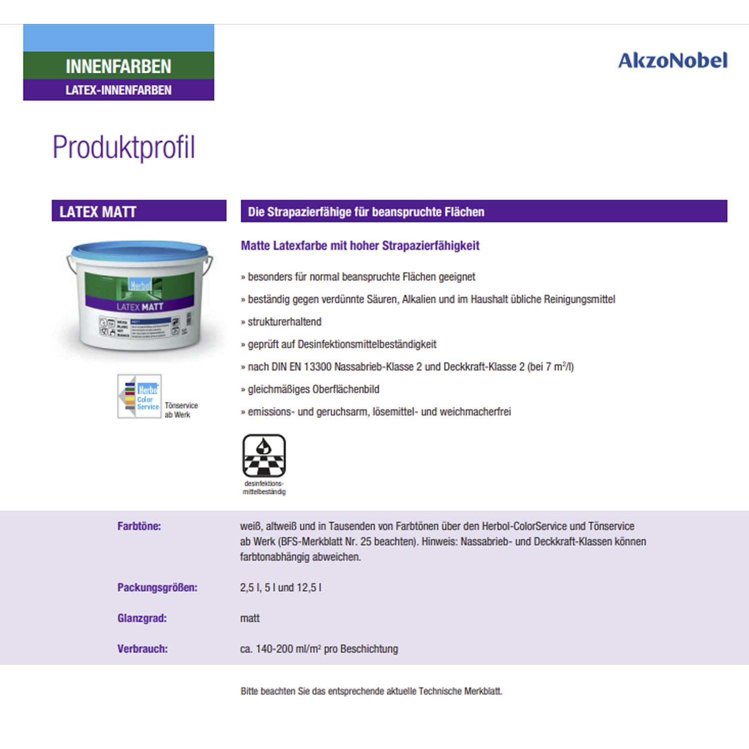 Herbol Latex Matt ist eine lösemittel- und weichmacherfreie, scheuerbeständige (Klasse 2), sehr gut Deckende (Klasse 2) Latexfarbe für beanspruchte Flächen im Innenbereich. Die Latexfarbe ist beständig gegen verdünnte Säuren, Alkalien und im Haushaltsübliche Reiniger. Durch ihre emissions- und geruchsarmen Eigenschaften ist die Wandfarbe besonders leicht und angenehm zu verarbeiten.