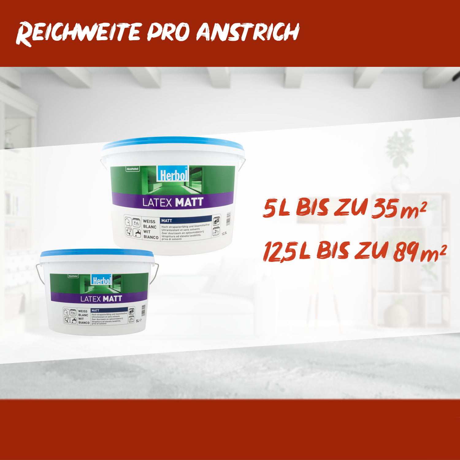 Herbol Latex Matt ist bestens geeignet zur Beschichtung auf trockenen, festen und tragfähigen Untergründen wie z.B. Raufaser- und Vliestapeten, Putze, Gipskartonplatten, Beton und Altanstrichen.