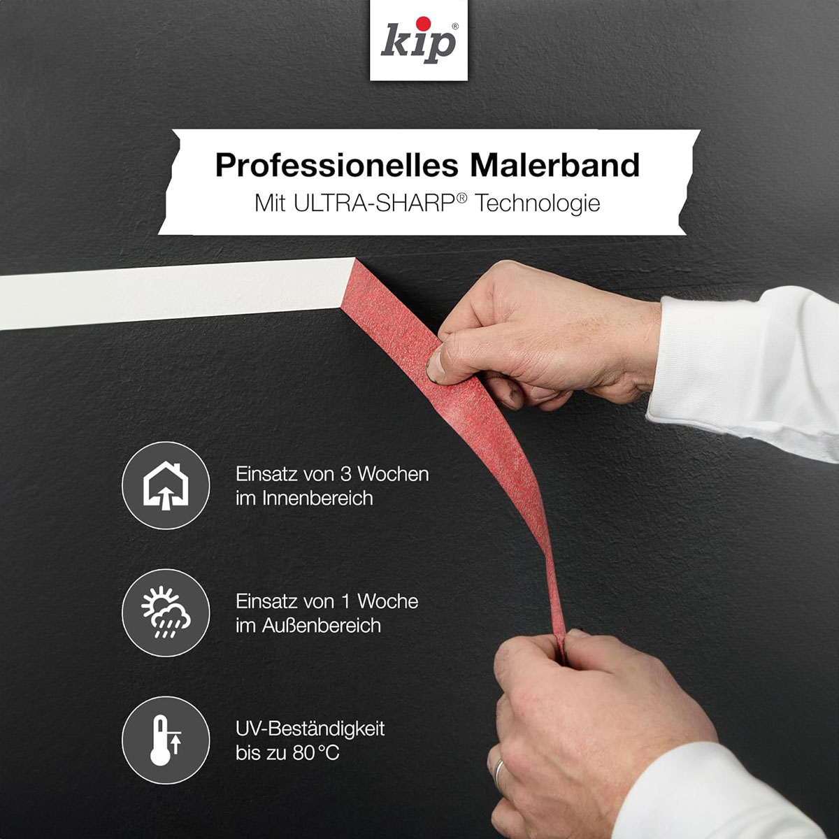 Kip 3301 Ultra Sharp ist ein hochwertiges Malerband mit Kautschuk-Kleber aus Spezialpapier. Durch die spezielle UltraSharp® Technologie können perfekte Farbkanten in einem Anstrich erzielt werden. Das Feinkrepp ist für Abdeckarbeiten auf glatten und rauen Untergründen geeignet und wird auf Grund des Spezialpapiers besonders für den professionellen Einsatz verwendet.