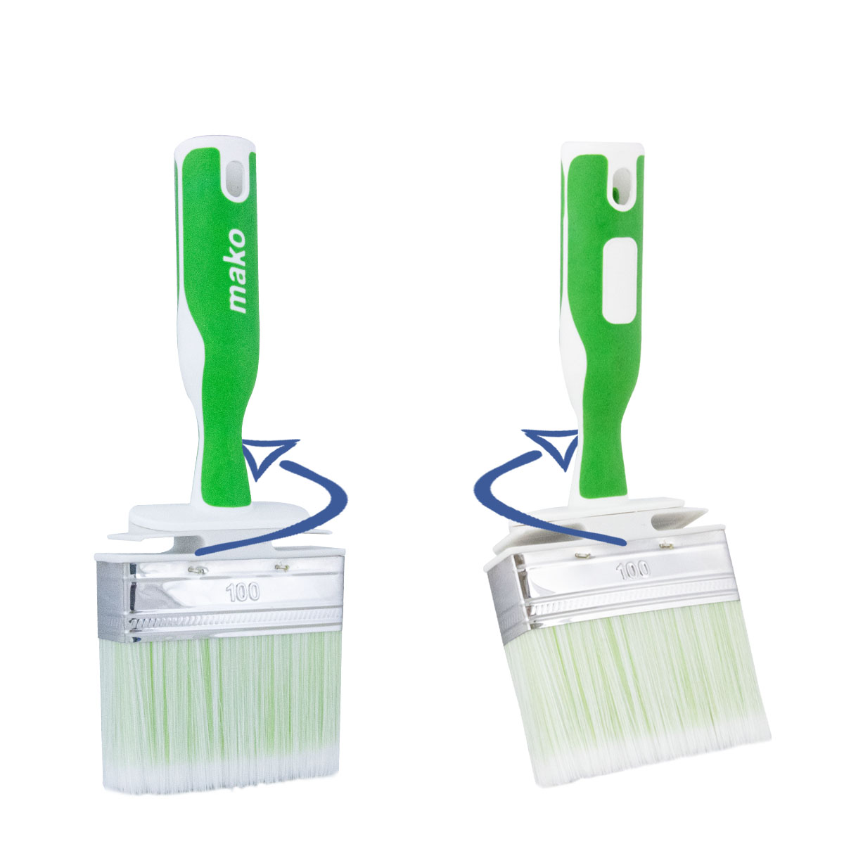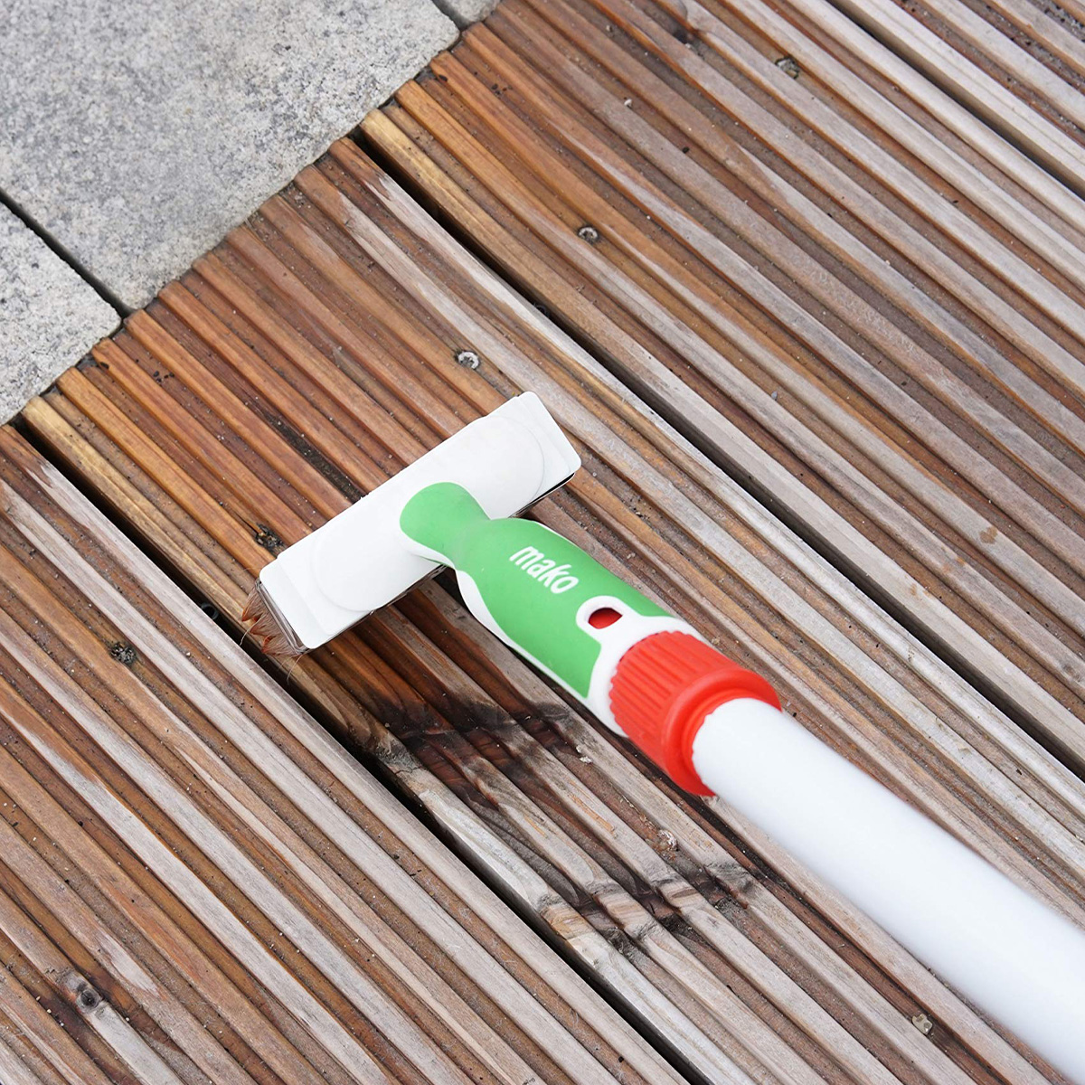Mako Lasur-Flächenstreicher Ergo 2K Premium ist ein hochwertiger Flächenstreicher mit einer Grün-weißen all for wood-Borstenmischung für alle Lasur- und Ölarbeiten. Die Borsten sind mit einer Edelstahlfassung an einem ergonomischen Kunststoffgriff befestigt. Dieser lässt sich um 180° drehen, um ihn in eine abgewinkelte Position zu stellen. Dadurch ist es möglich auch Fußböden zu streichen oder zu ölen. Der Flächenstreicher besitzt noch eine praktische Arretierung für Verlängerungsstäbe, sodass das Verarbeiten von Terrassenölen vereinfacht wird.