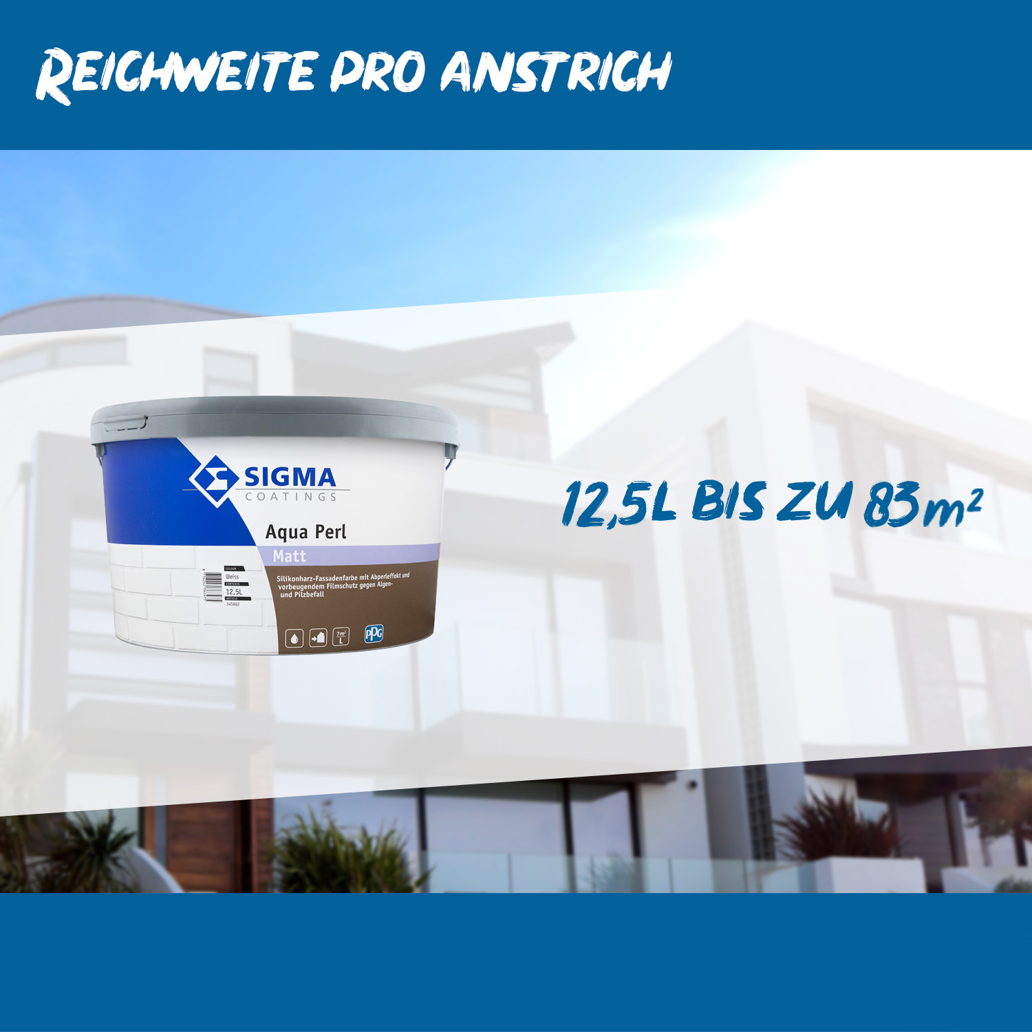Sigma Aqua Perl Silikonharz Fassadenfarbe ist bestens geeignet für hochwertige und diffusionsfähige Fassadenbeschichtungen auf mineralischen Untergründen, sowie alten tragfähigen Silikat-, Silikonharz oder Dispersionsfarbenanstrichen und Putzen.